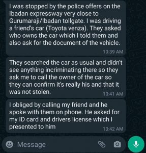 The man said he was stopped by officers close to the Gurumaraji camp along the Ibadan expressway.