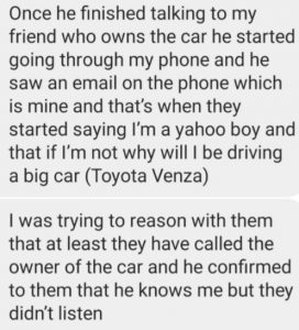 He told LIB: “They started saying I’m a Yahoo boy and that if I’m not why will I be driving a big car (Toyota Venza)”.