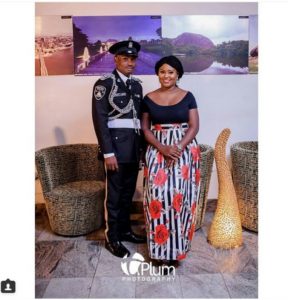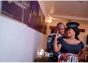 Nigerian police officer knelt down with one leg as his wife-to-be sat on the other lap in lovely pre-wedding photoshoot.