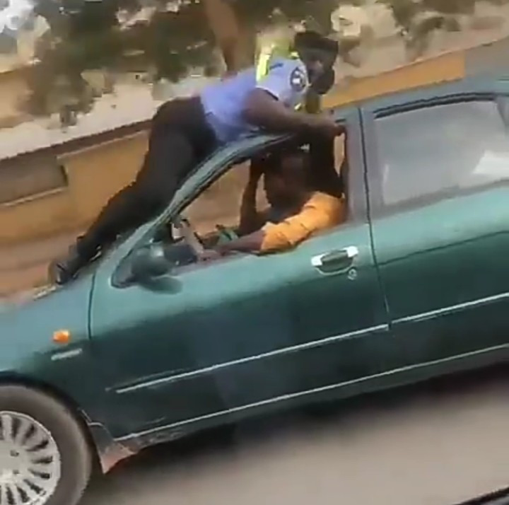 In a video shared online, the police officer is seen laying across the bonnet and roof of the cab while the car was still in motion.