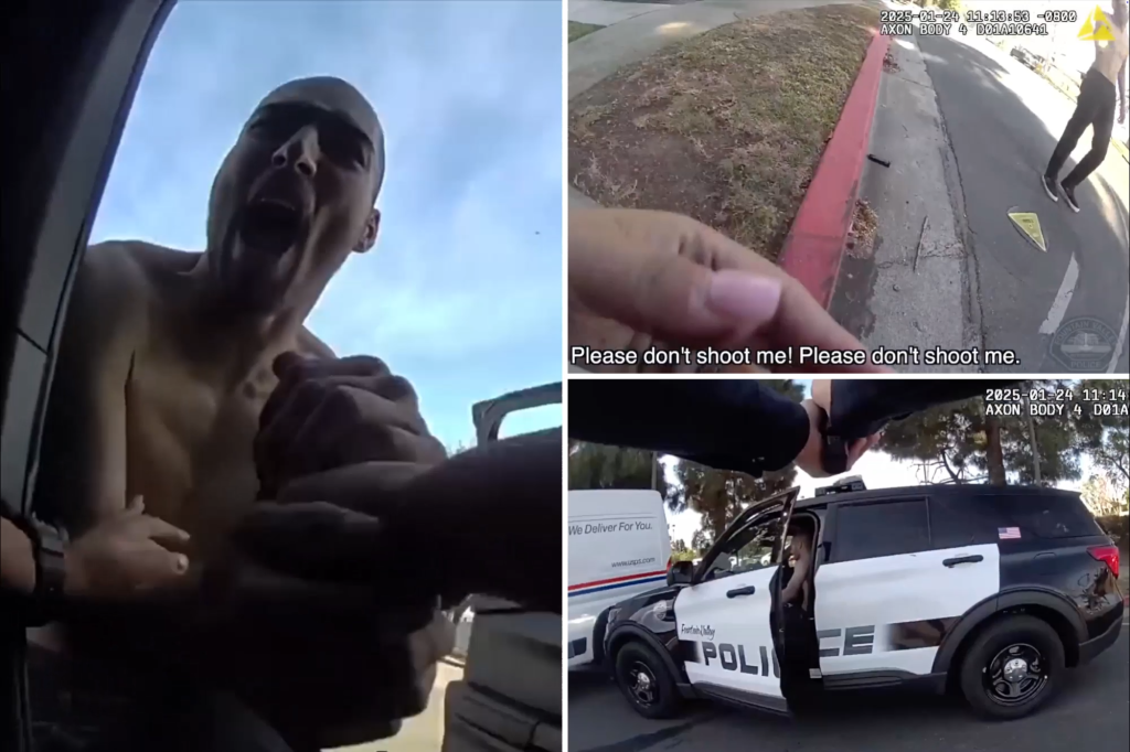 The video, taken on January 24 in Fountain Valley, Orange County, shows a disturbing confrontation with 26-year-old Osean McClintock, who appeared shirtless and agitated. At one point, the suspect forcibly wrestled the gun from the screaming female officer, prompting a desperate plea: “Please don’t shoot me!”