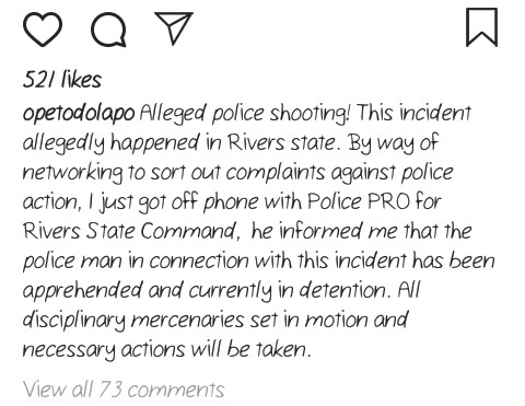 Alleged police shooting! This incident allegedly happened in Rivers state. By way of networking to sort out complaints against police action, I just got off phone with Police PRO for Rivers State Command, he informed me that the police man in connection with this incident has been apprehended and currently in detention. All disciplinary mercenaries set in motion and necessary actions will be taken.