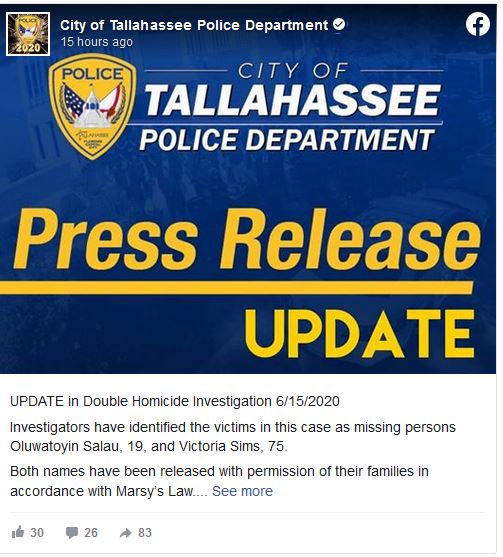 The TPD identified 19-year-old Oluwatoyin “Toyin” Salau and Victoria Sims, 75, a AARP volunteer as victims of a double-homicide. Both women were reported missing before being found dead in the area.
