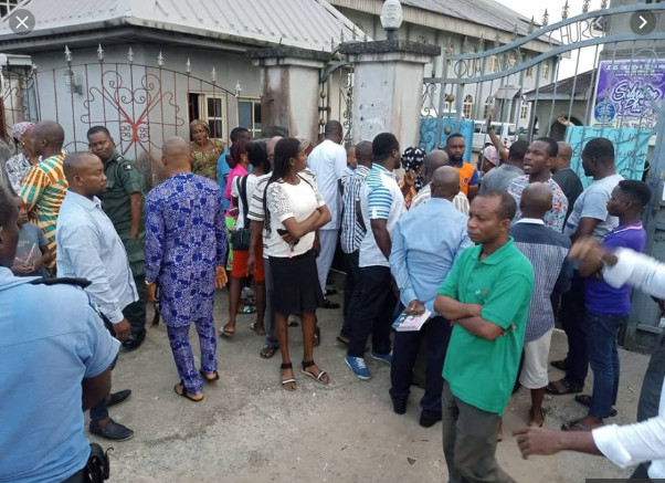 Members of Qua Iboe Church being locked out by the women who protested at the church premises on Saturday