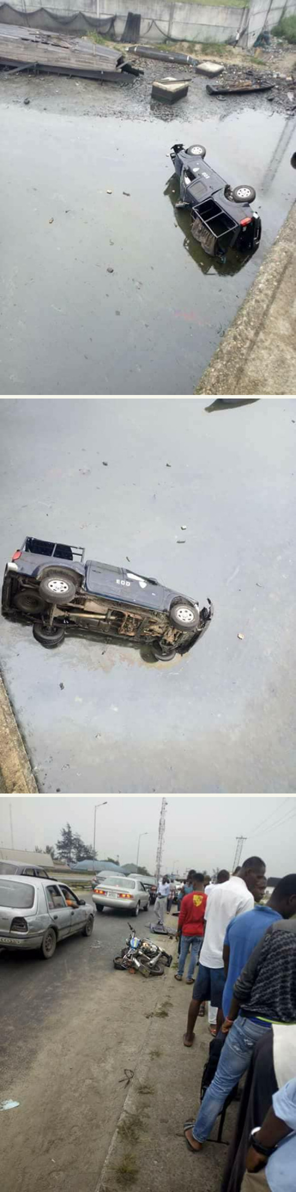 A police van veered off the Eastern bypass Bridge in Port-Harcourt, Rivers state capital and plunged into a canal. The incident happened early this morning while the officers where allegedly chasing a vehicle believed to be carrying diesel.