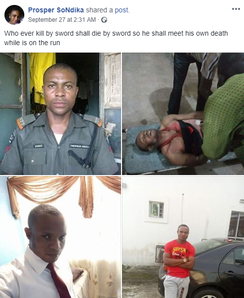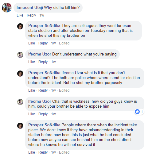 The deceased, identified as Owai Owai a.k.a ‘Temple’. was among the police officers deployed to secure Osun governorship election last month. He was shot on the chest and his family members claim that witnesses told them he was shot by another officer identified as Theophilus Aghaulor with police number 410022 (Pictured above).