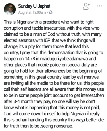 “This is Nigeria, with a president who want to fight corruption and tackle insecurities, with the vice who claimed to be a man of God without truth, with many elected senators, with IGP that we think things will change, its a pity for them, those that lead this country, I pray that this demonstration that is going to happen on 14 /8 in Maiduguri, Yobe, Adamawa and other places that mobile police on special duty are going to hold for their allowances be the beginning of something in this great country led by evil men, we are inviting all the media to be there for us, this people call their self leaders are all aware that this money use to be in some people joint account to get interest,then after 3-4 month they pay, no one will say he don’t know what is happening that this money is not paid, God will come down himself to help Nigerian if really this is buhari handling this country this way,i better die for truth then to be, seeing nonsense”.
