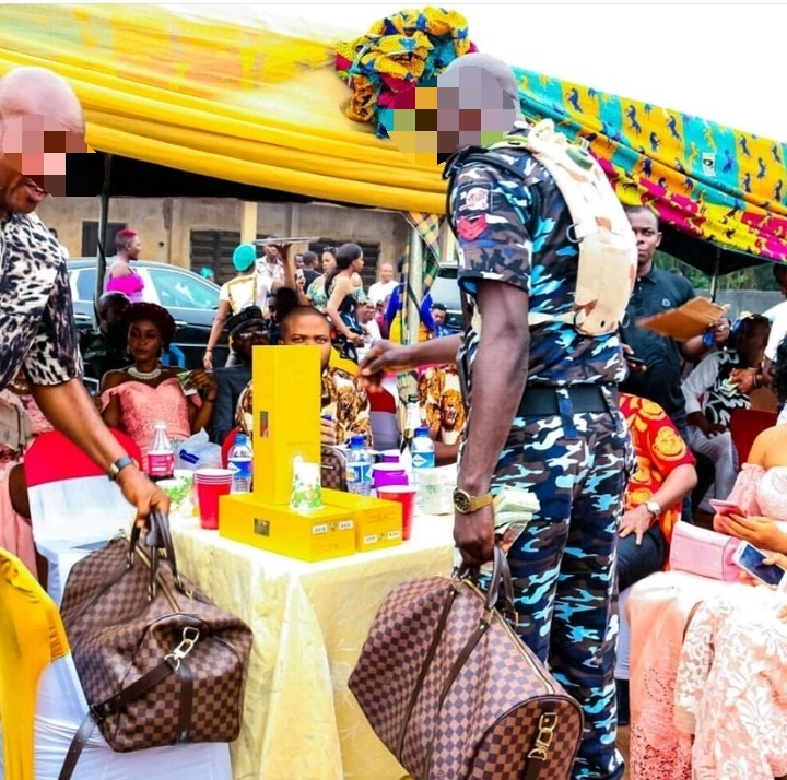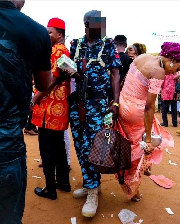 A Nigerian policeman was seen carrying a money bag for a Lagos big boy at a wedding event on Saturday in Mbaise, Imo State.