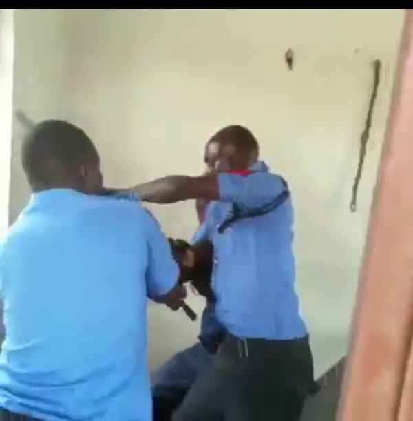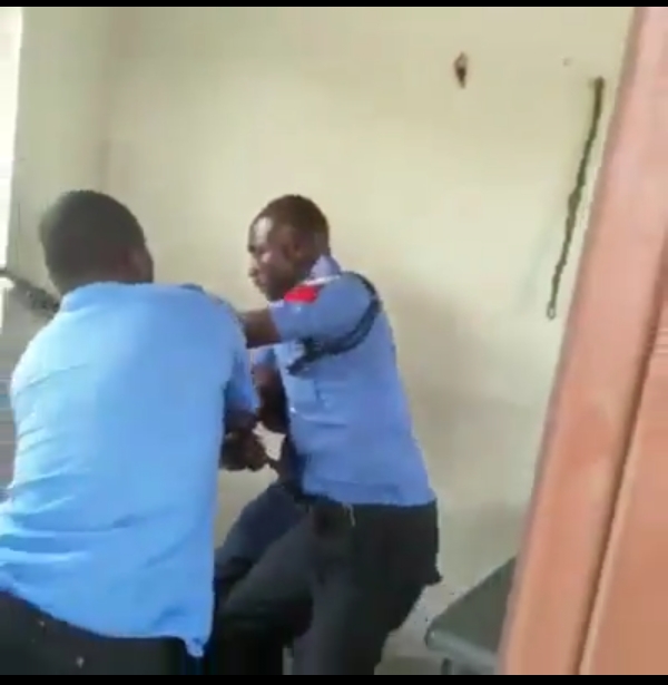 Photos have emerged of 4-5 policemen men fighting dirt with another security officer who seems to be a Civil Defence Officer.The policemen were pictured kicking the security officer who resiliently held the gun of one of them.This is a shameful act from the two arms of the security men who are meant to maintain law and order.