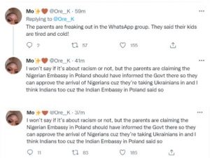 According to @Ore_K, these Nigerians trekked for hours to get to Poland. She added that parents whose children are fleeing Ukraine, are saying Nigerian Embassy in Poland should have informed Polish government so they can approve the arrival of Nigerians because they are taking in Ukrainians and Indians.