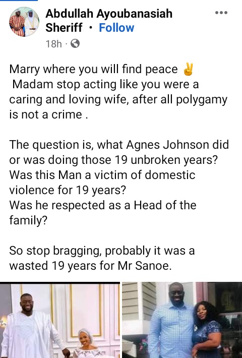 “Marry where you will find peace. Madam stop acting like you were a caring and loving wife, after all polygamy is not a crime. The question is, what Agnes Johnson did or was doing those 19 unbroken years? Was this Man a victim of domestic violence for 19 years? Was he respected as a Head of the family? So stop bragging, probably it was a wasted 19 years for Mr. Sanoe,” he wrote.