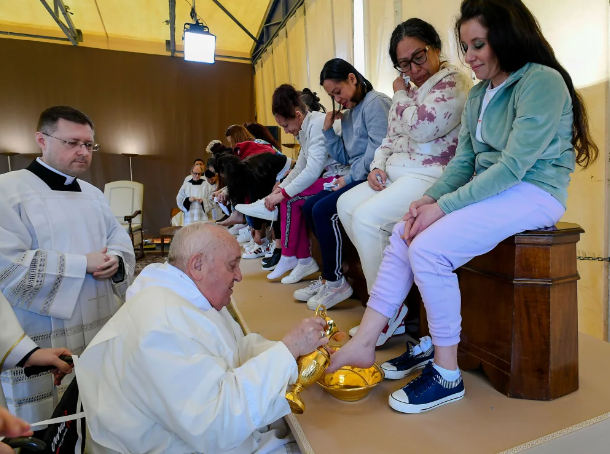 Many of the women wept as Francis washed their feet, gently pouring water over one bared foot and patting it dry with a small towel. He finished the gesture by kissing each foot, often looking up to the woman with a smile.