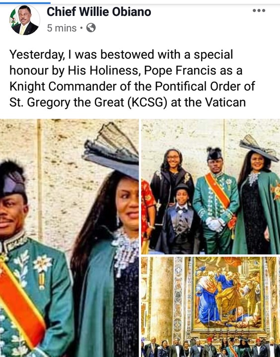 Anambra State Governor, Willie Obiano and his family met with Pope Francis who honored him with a Knight title.