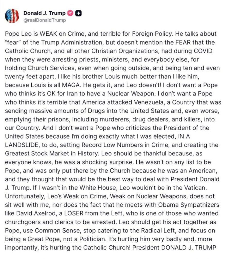 “Pope Leo is WEAK on Crime, and terrible for Foreign Policy,” Trump wrote in a post on Truth Social.