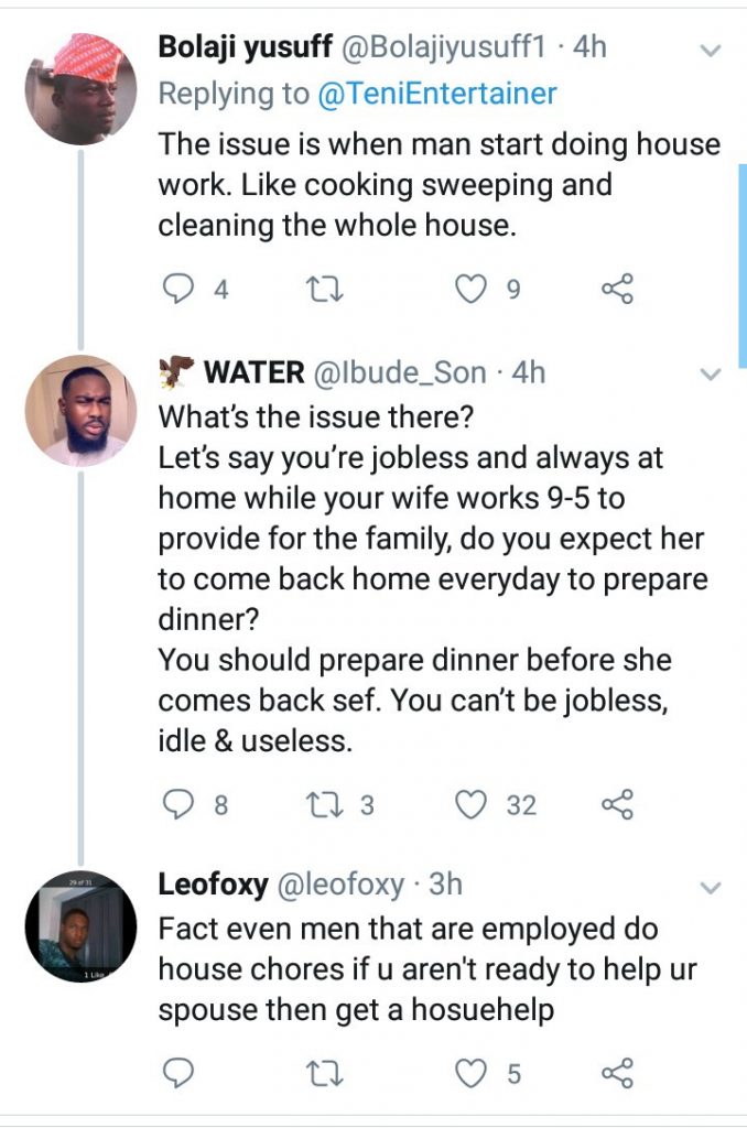 Her follower, Bolaji Yusuff responded: “The issue is when man start doing house work. Like cooking sweeping and cleaning the whole house.”