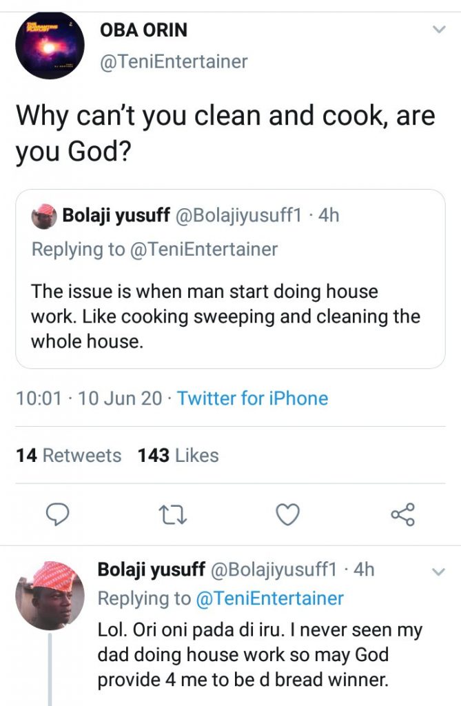 Yusuff replied: “Lol. Ori oni pada di iru. I never seen my dad doing house work so may God provide 4 me to be d bread winner.”