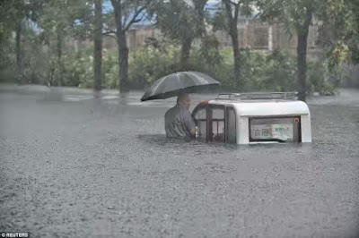 It is said that pictures tell a thousand stories, these pictures tell a tale of the haves and the have nots. In scenes which succinctly describe the yawning gulf between the rich and poor in China, the driver of a Porsche car left his luxury ride to the mercy of floodwaters while the driver of a three wheel delivery van refused to leave his vehicle despite being almost chest deep in floodwaters.