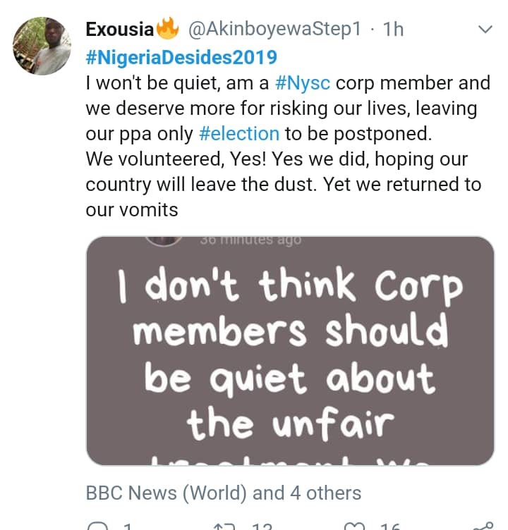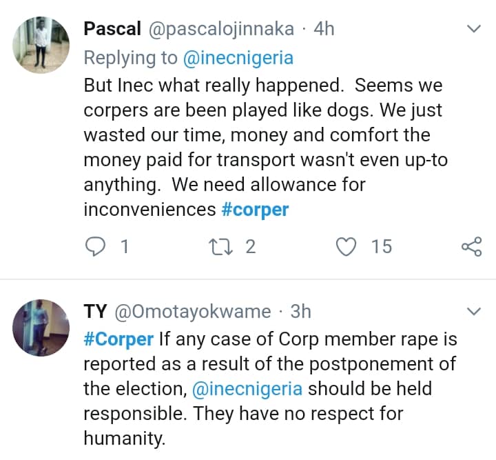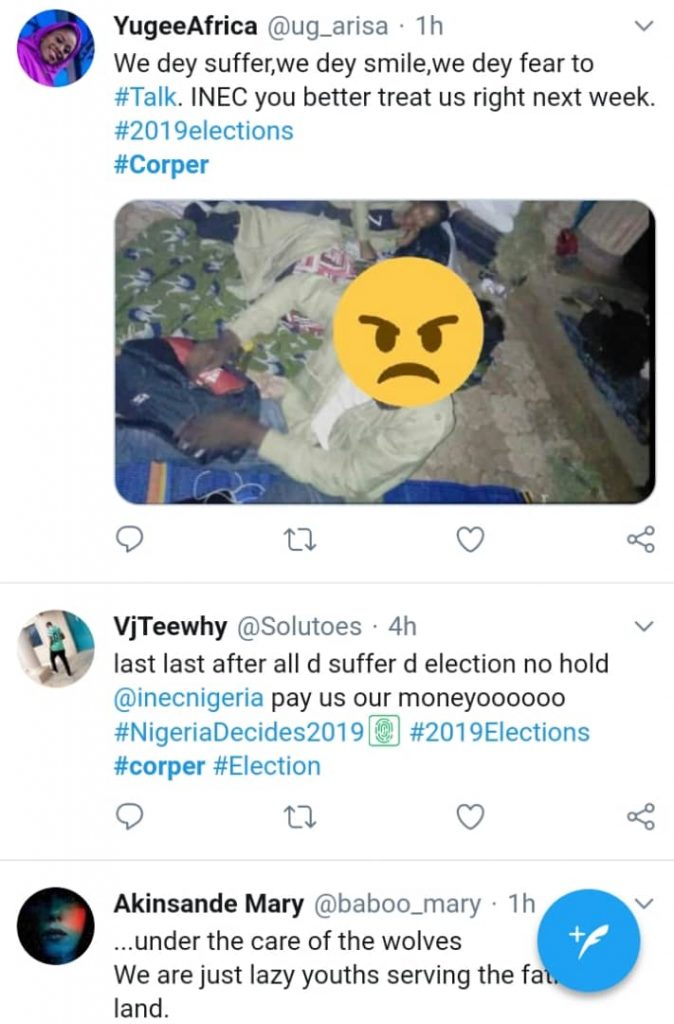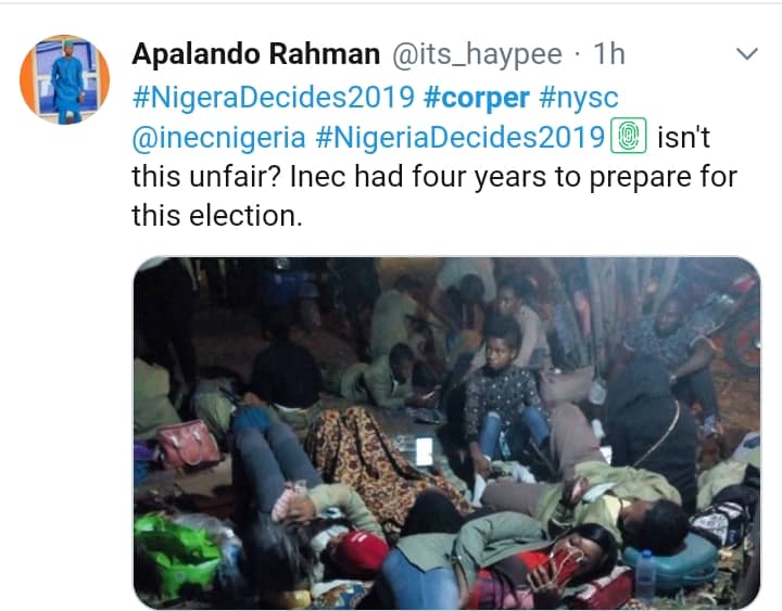 Many of the corpers were seen sleeping outside at night, yet the elections were postponed.