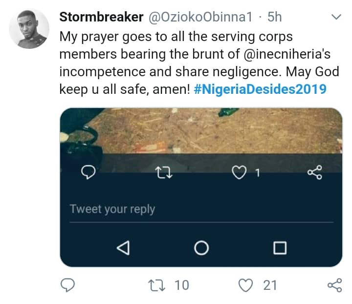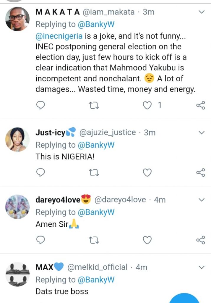 “While we are all frustrated, please spare a thought for people who are most affected by the postponement… like our corpers who had to spend the night in terrible sleeping conditions, people who had weddings or other milestone occasions planned, etc. May God help us all.”