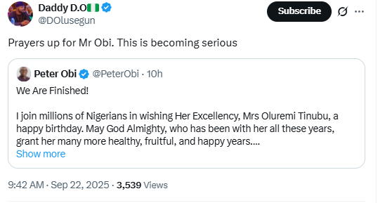 Reacting to Obi’s comment, Dada via his X handle insinuated that something is wrong with Obi for making such comments and called for prayers for the former Presidential candidate.