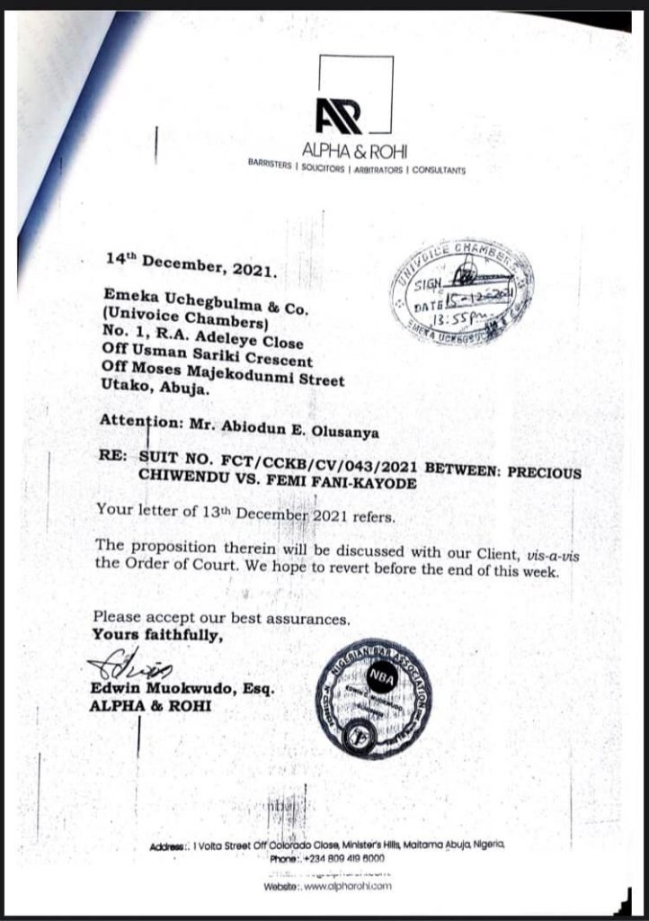 Responding to the claim, the former Minister of Aviation’s lawyer who noted that they asked Precious’ lawyer to give them more time to confer with their client on her proposition on December 14, accused her of trying to incite the public against FFK with the claim she made on December 16, 2021.
