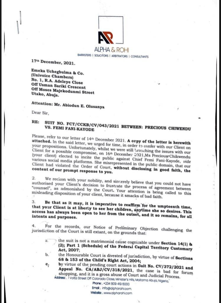 Femi Fani-Kayode’s lawyers have responded to Precious Chikwendu’s claim of being granted a court order to see their four children, at least three times this festive period, IgbereTV reports.