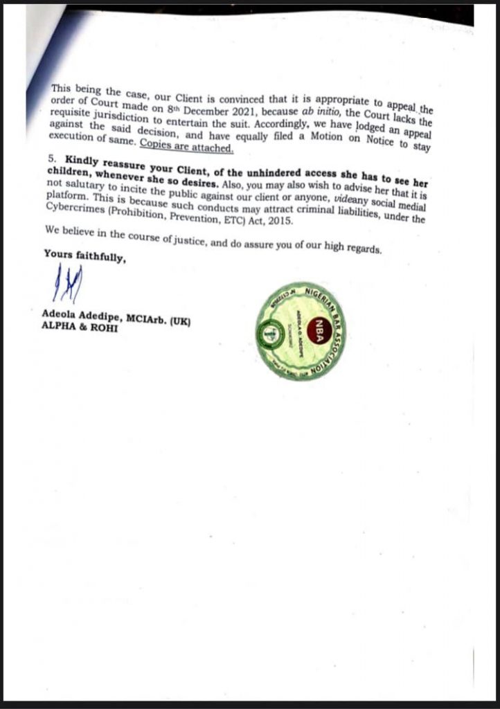 Accusing the mother of four of misrepresenting the court order, they maintained that she is at liberty to see her children and it has always been so.