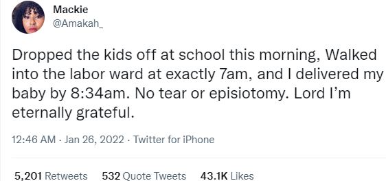 “A new mother took to Twitter to thank God for an effortless childbirth.