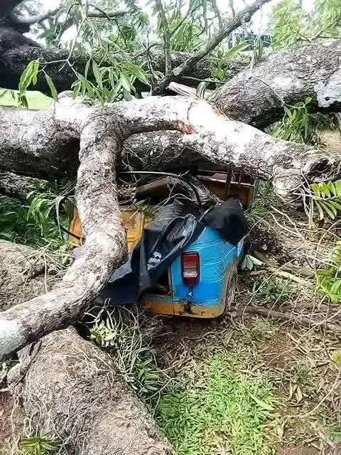 “The tree fell directly on the keke, and it was completely flattened. We couldn’t believe our eyes when the man and his pregnant wife came out unharmed. Everyone around was shouting and thanking God,” a resident recounted.