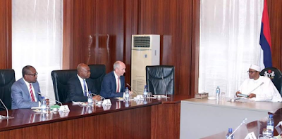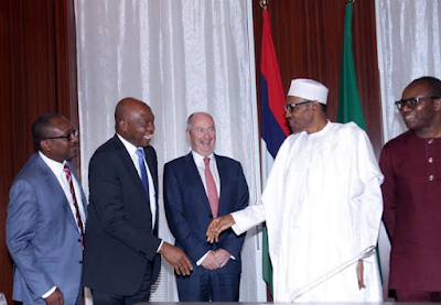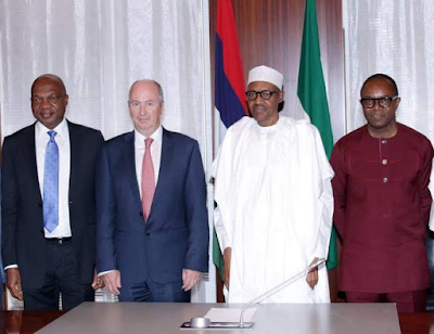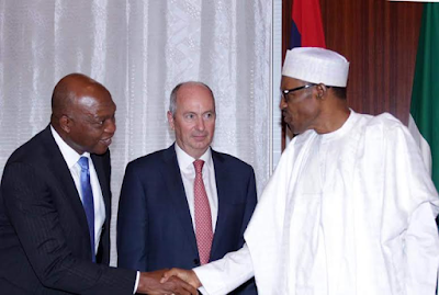 President Buhari who is the Minister of Petroleummet with Shell Global Upstream Director, Andrew Brown and Shell Nigeria’s MD, Osagie Okunbor at the State House, Abuja today May 20th. More photos after the cut.
