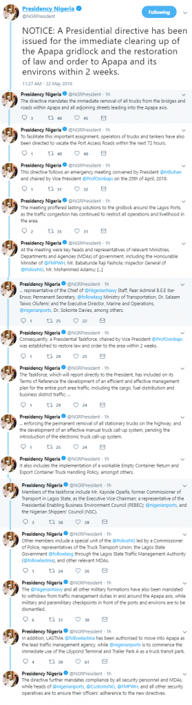 A statement released on the presidency’s official twitter handle @AsoRock, says all truck operators and drivers are to vacate all roads leading to the port within 72 hours.