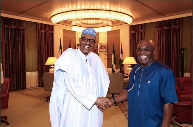 President Buhari In A Happy Mood As He Meets With David Mark At The State House
