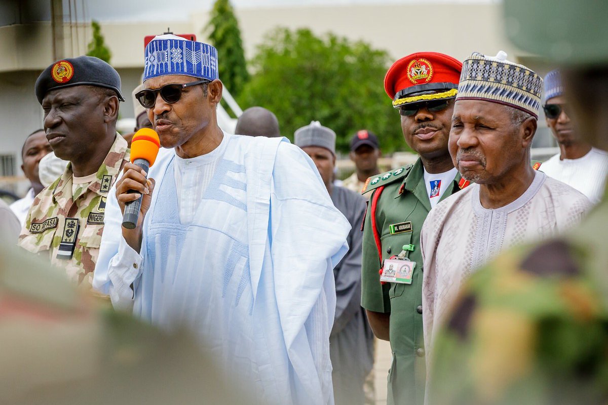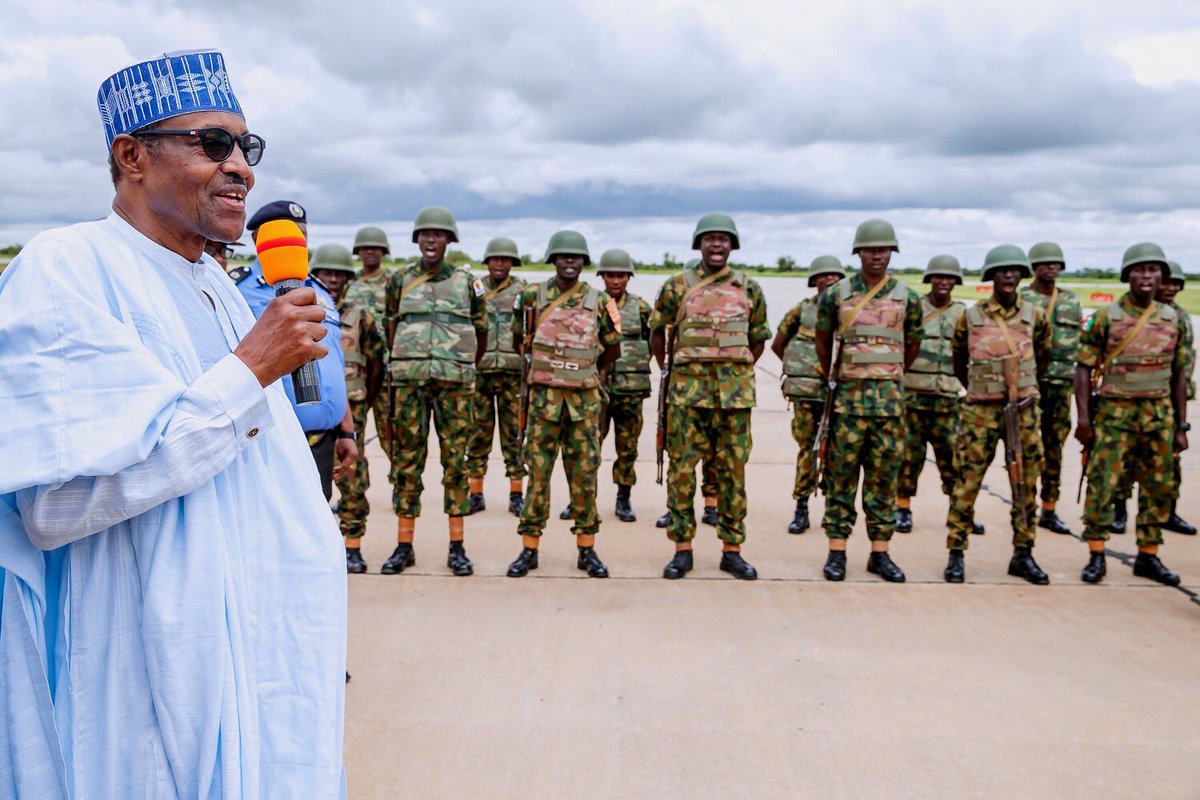 Before departing Katsina for Abuja today, President Buhari met with military personnel deployed to curb the activities of bandits and criminals in Zamfara and neighbouring states under Operations Sharan Daji and Diran Mikiya, at the Katsina Airport.