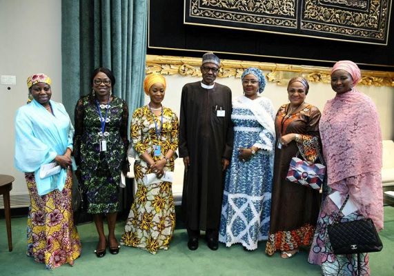Pres. Buhari pictured his wife Aisha Buhari shortly after he addressed World Leaders at UNGA 71 in NewYork yesterday 20th September. Also in the photo are Wife of the Kebbi State Governor Dr Zainab Atiku Bagudu, wife of Oyo State Governor, Mrs Florence Ajimobi, Wife of Ogun State Governor, Mrs Olufunso Amosun & Senior Special Assistant to Wife of the President, Mrs Hajo Sani