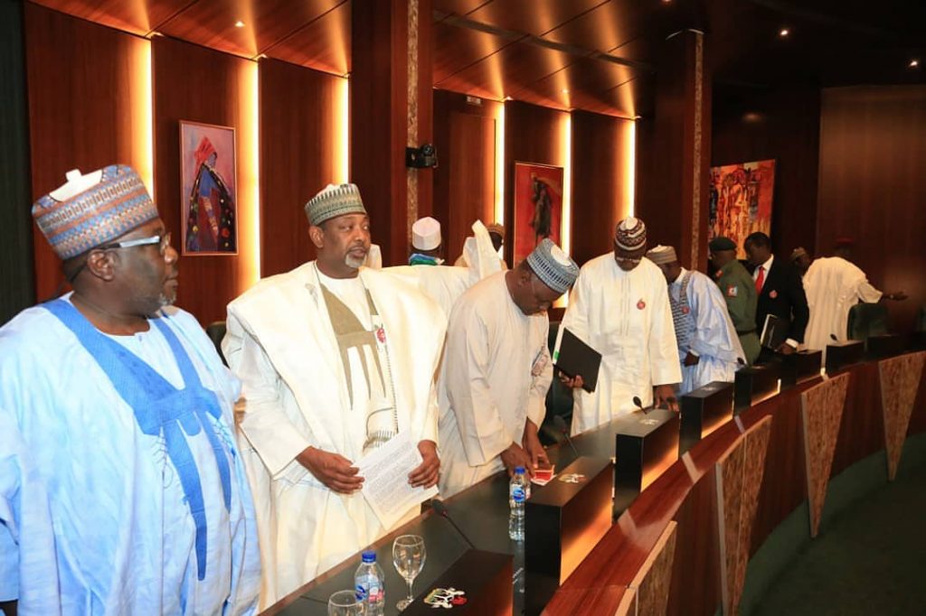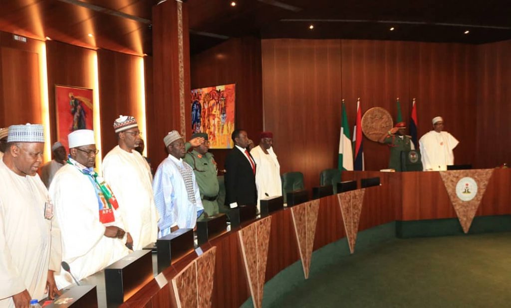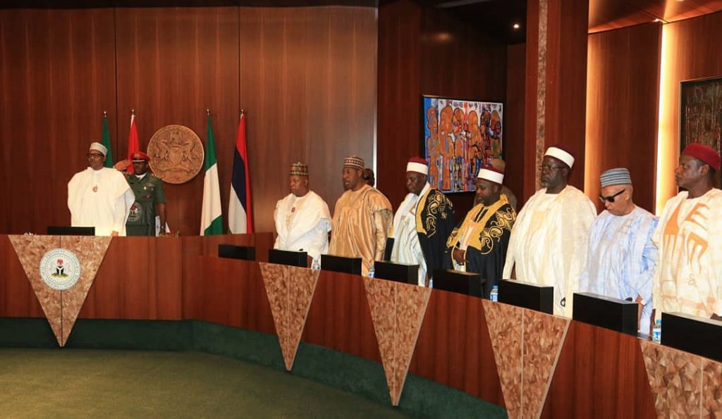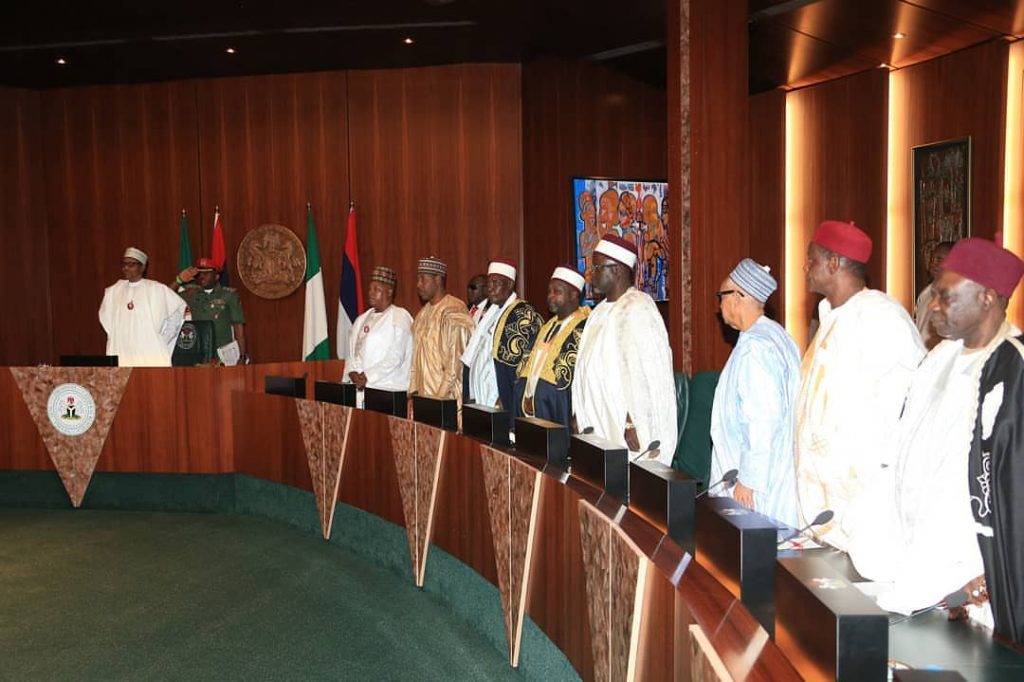 President Muhammadu Buhari, Chief of Staff Mallam Abba Kyari, NSA Major Gen Babagana Monguno, Chief of Defence Staff, General Abayomi Olonisakin, DG DSS, Yusuf Bichi, DG NIA Alkali Ahmed Rufai, Chairman Senate Committee on Defence, Senator Mohammed Ali Ndume, Senator Abubakar Kyari and others during a courtesy visit by delegation of Borno Elder at the State House in Abuja.
