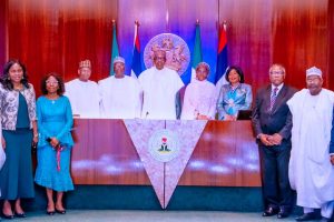 President Buhari with L-R: Accountant General of the Federation Ahmed Idris, Chief of Staff Prof. Ibrahim Gambari, Finance Minister Zainab Ahmed, and ICAN President Mrs. Comfort Eyitayo during an audience with the President and Members of the Institute of Chartered Accountants of Nigeria (ICAN) in State House on 8th April 2022