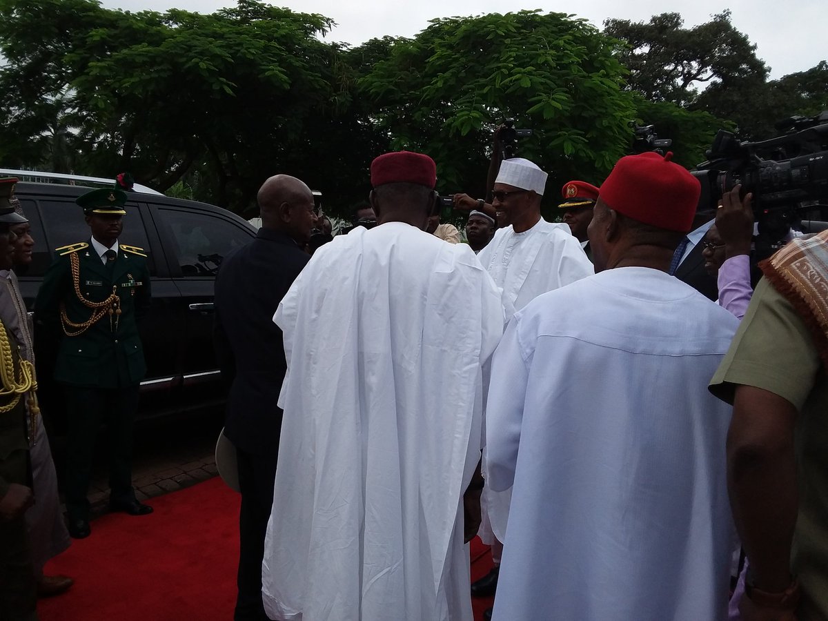 Below are pictures of President Museveni of Uganda being received by President Buhari at the State House in Abuja.