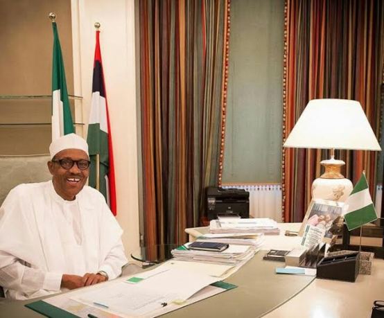 President Buhari arrived back in Nigeria after his vacation and medical Leave in London, yesterday June 19. He’s pictured today, smiling and back to work in his office at the Presidential Villa, Abuja.
