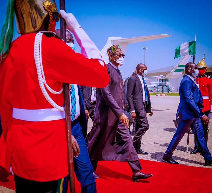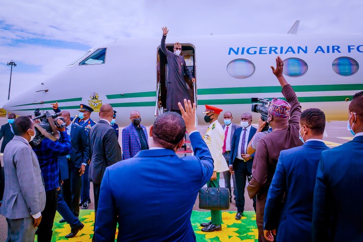 The presidential aircraft landed at the Presidential Wing at the Nnamdi Azkiwe International airport, Abuja at about 4.31 pm local time The president was received by other top government officials.