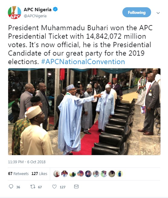 President Muhammadu Buhari of the All Progressives Congress (APC) has been declared the candidate representing APC come 2019 with 14,842,072 Million.