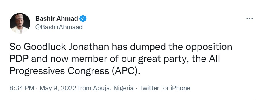 Presidential aide, Bashir Ahmad has taken to Twitter to reveal that ex-President Goodluck Jonathan is now a member of the All Progressives Congress.