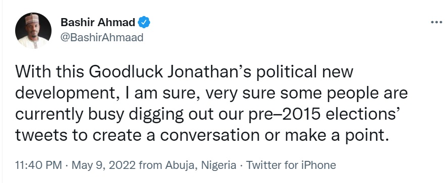 “With this Goodluck Jonathan’s political new development, I am sure, very sure some people are currently busy digging out our pre–2015 elections’ tweets to create a conversation or make a point.”