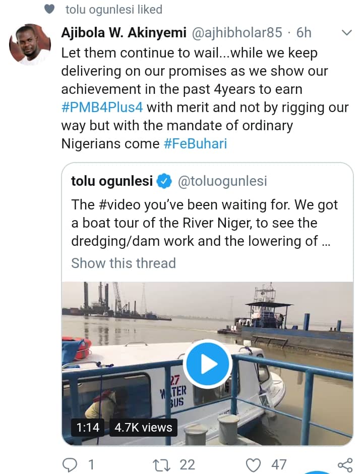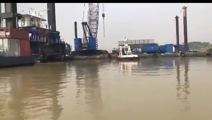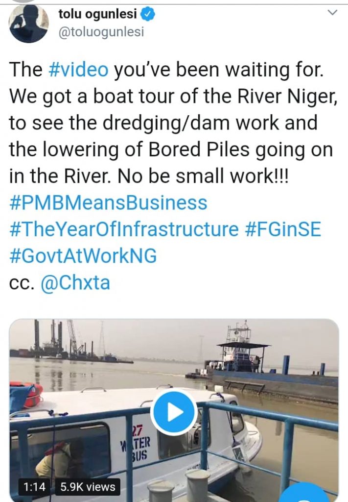 “The #video you’ve been waiting for. We got a boat tour of the River Niger, to see the dredging/dam work and the lowering of Bored Piles going on in the River. No be small work!!! #PMBMeansBusiness #TheYearOfInfrastructure #FGinSE #GovtAtWorkNG.”