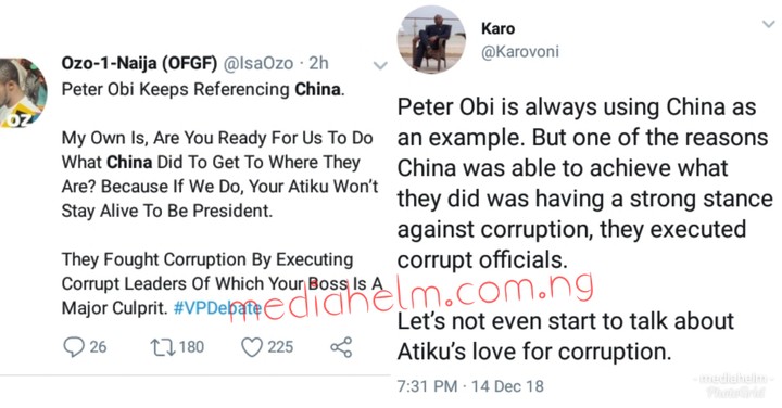During the vice-presidential debate in Abuja today, Peter Obi talked about making Nigeria get to where China is today and doing business with them. But Twitter users blast him for him for saying so, because if Nigeria can execute all it’s corrupt politicians which China actually did, Atiku won’t for contesting for president because he is one of the Notorious corrupted Politicians in the Nigerian history.