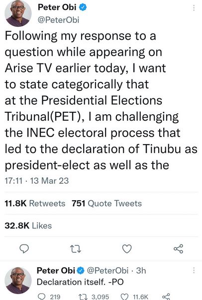 He Tweeted: “Following my response to a question while appearing on Arise TV earlier today, I want to state categorically that at the Presidential Elections Tribunal (PET), I am challenging the INEC electoral process that led to the declaration of Tinubu as president-elect as well as the declaration itself.”