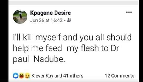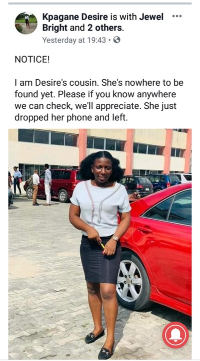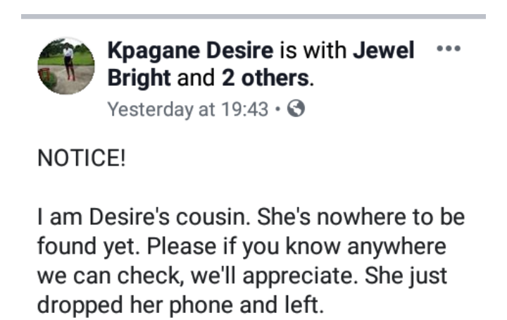 Before Desire disappeared on Wednesday, June 26, she posted on Facebook that she was going to kill herself and her ‘flesh’ should be fed to a lecturer at the University identified as Dr. Paul Nadure.