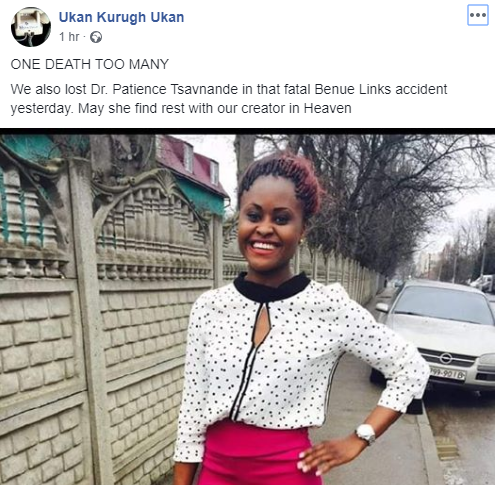 Pretty Dr. Patience Tsavnande is one of the casualties recorded in the Benue Links fatal accident that occured yesterday September 15th.