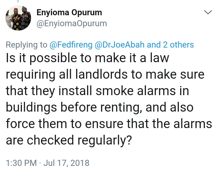 The Nigerian Federal Fire Service recently shared a tweet that reads, ‘smoke alarms save lives, but only if they’re working. Test all smoke alarms at least once a month. Press the test button to be sure the alarm is working’.