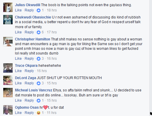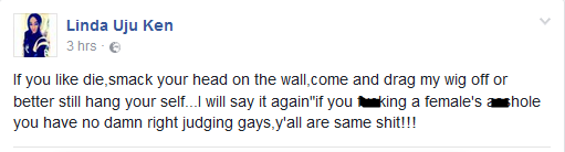 If you like die, smack your head on the wall,come and drag my wig off or better still hang your self…I will say it again”if you f**king a female’s a**hole you have no damn right judging gays,y’all are same poo!!!