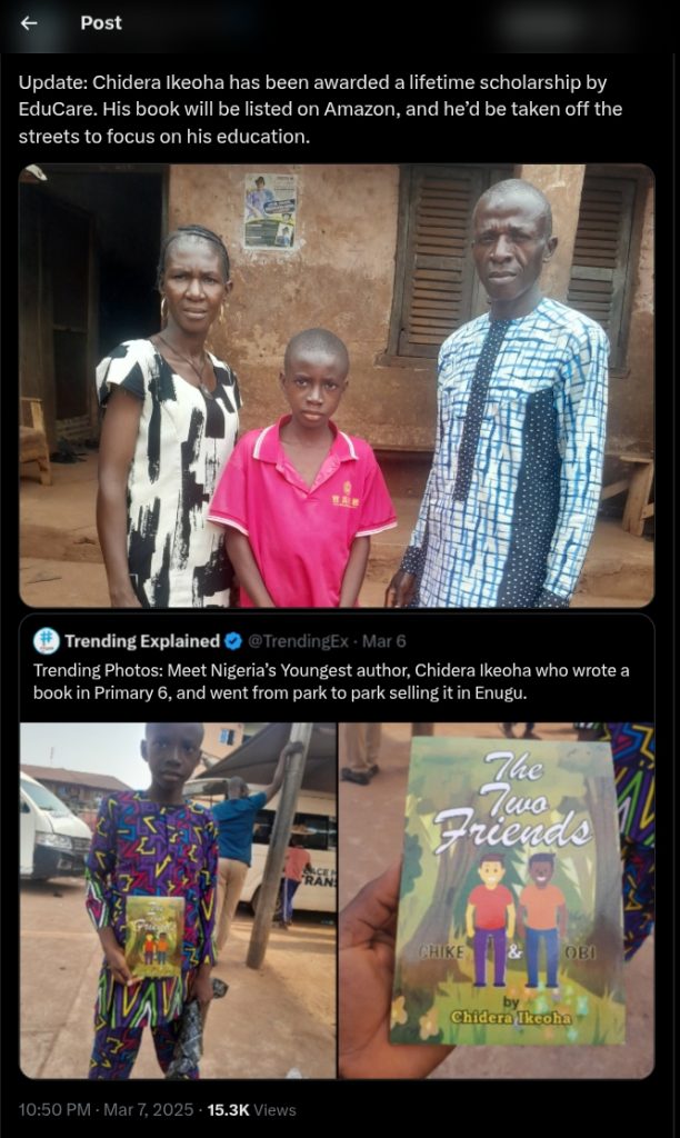 A follow-up update later announced: “Update: Chidera Ikeoha has been awarded a lifetime scholarship by EduCare. His book will be listed on Amazon, and he’d be taken off the streets to focus on his education.”